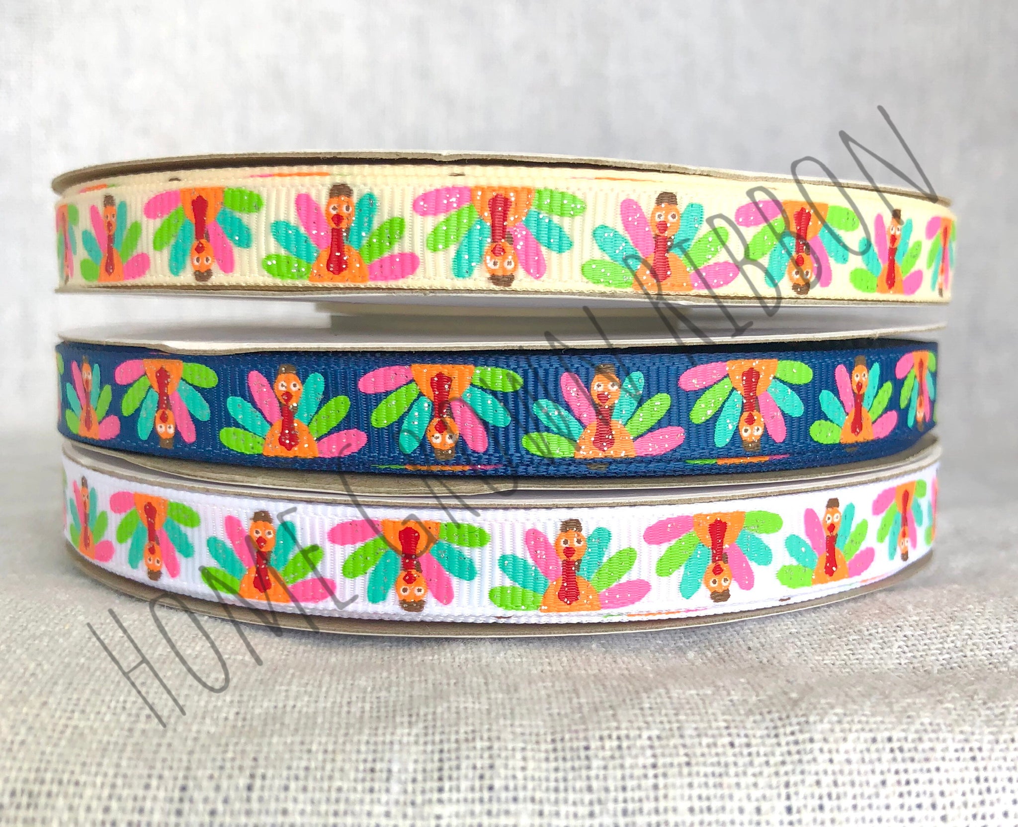 "Thankful to be Me" Turkeys coordinate fall and Thanksgiving themed ribbon printed in ink with light glitter accents.