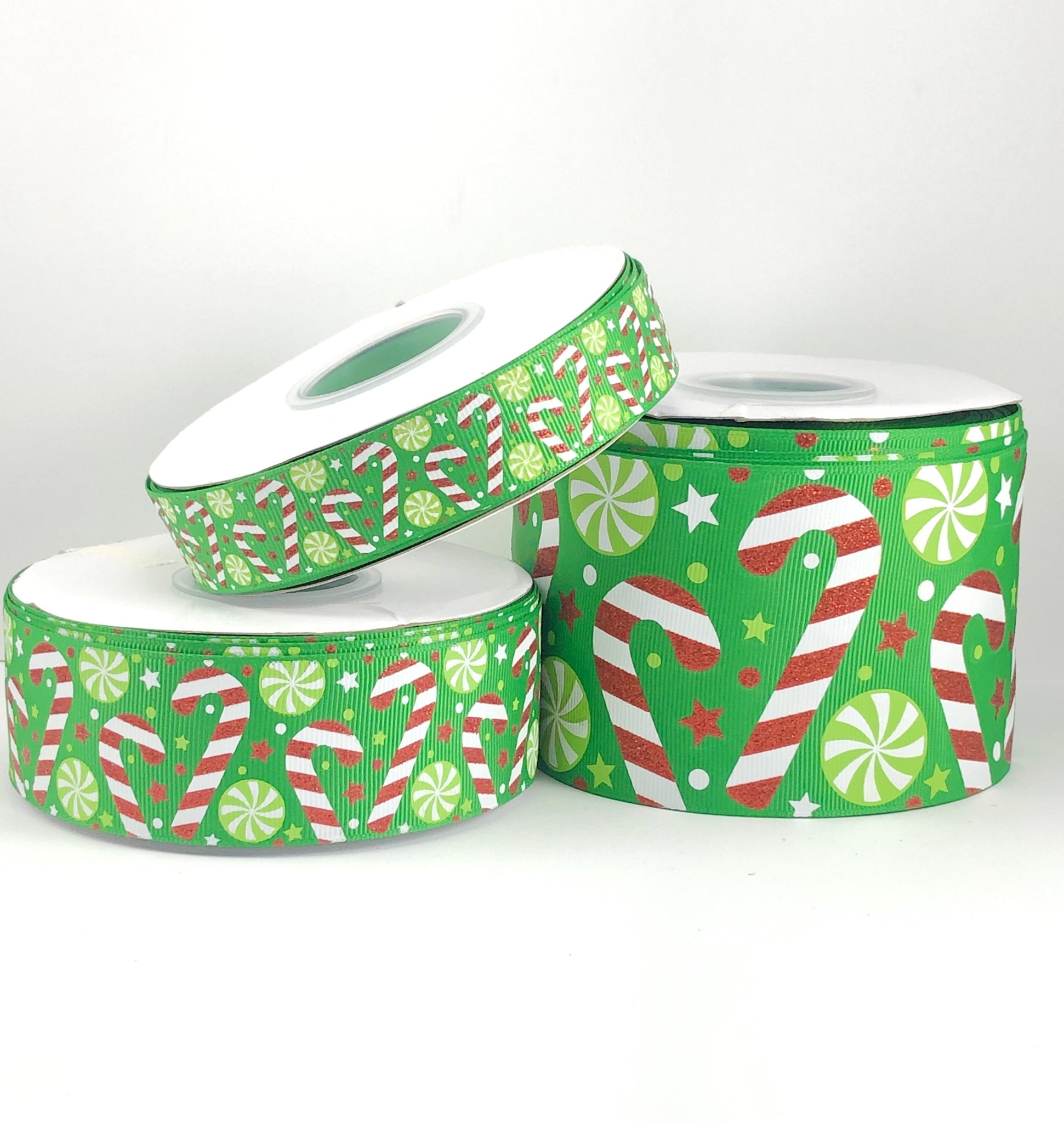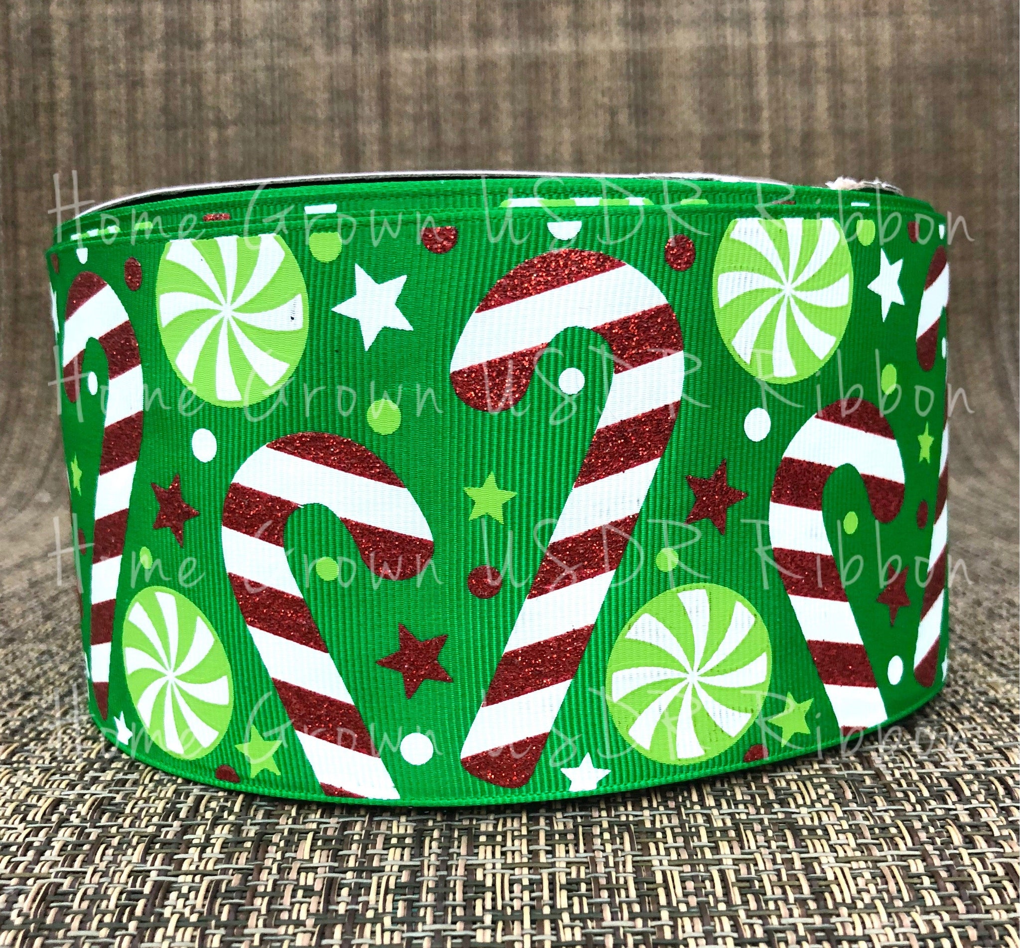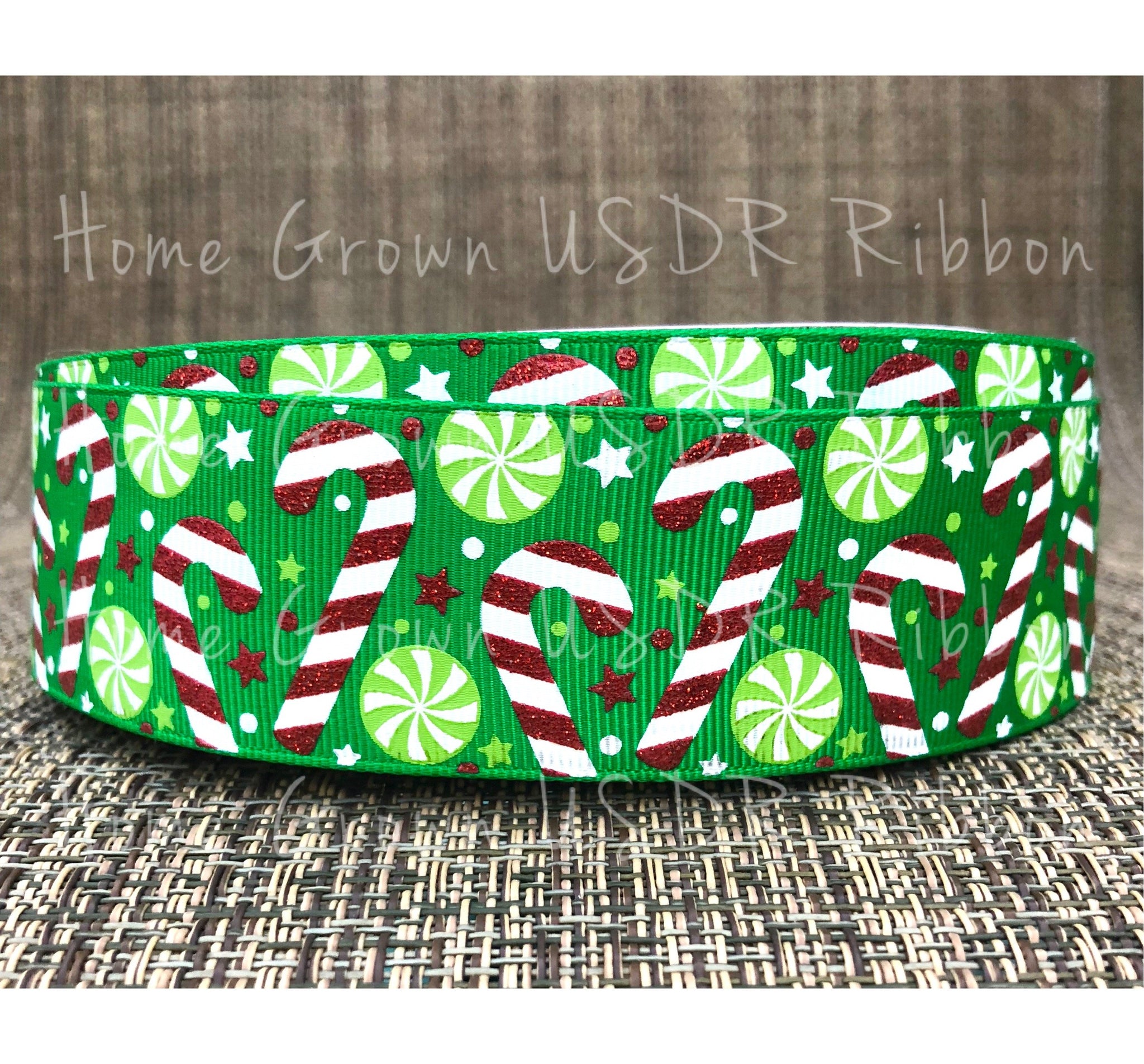 Christmas Candy Cane Holiday USDR Ribbon. Candy Canes and christmas mints printed in white and green ink with red glitter ink accents on green ribbon.