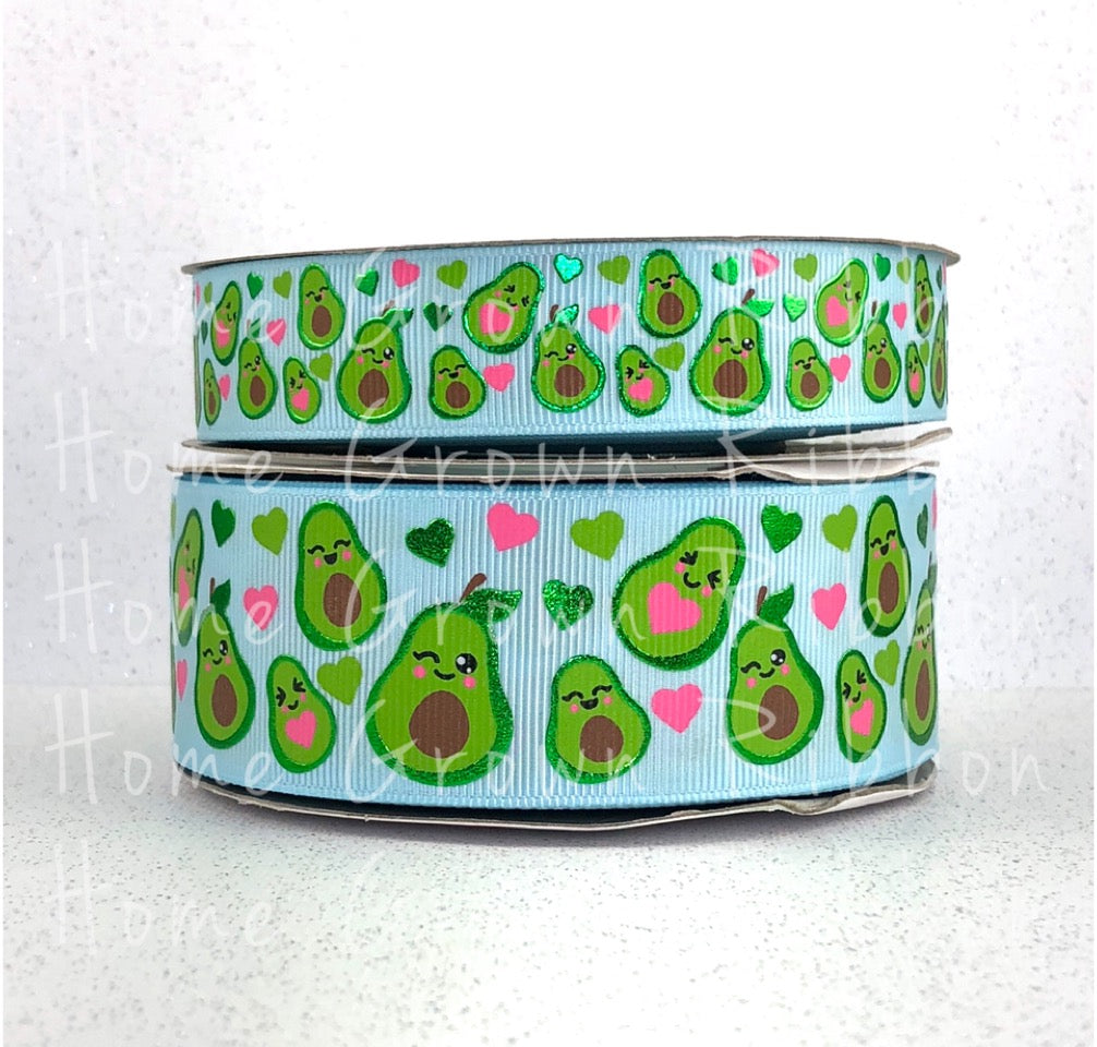 Adorable Avocado's printed on 7/8" and 1.5" Grosgrain Ribbon in Ink with Dark Green Foil accents.